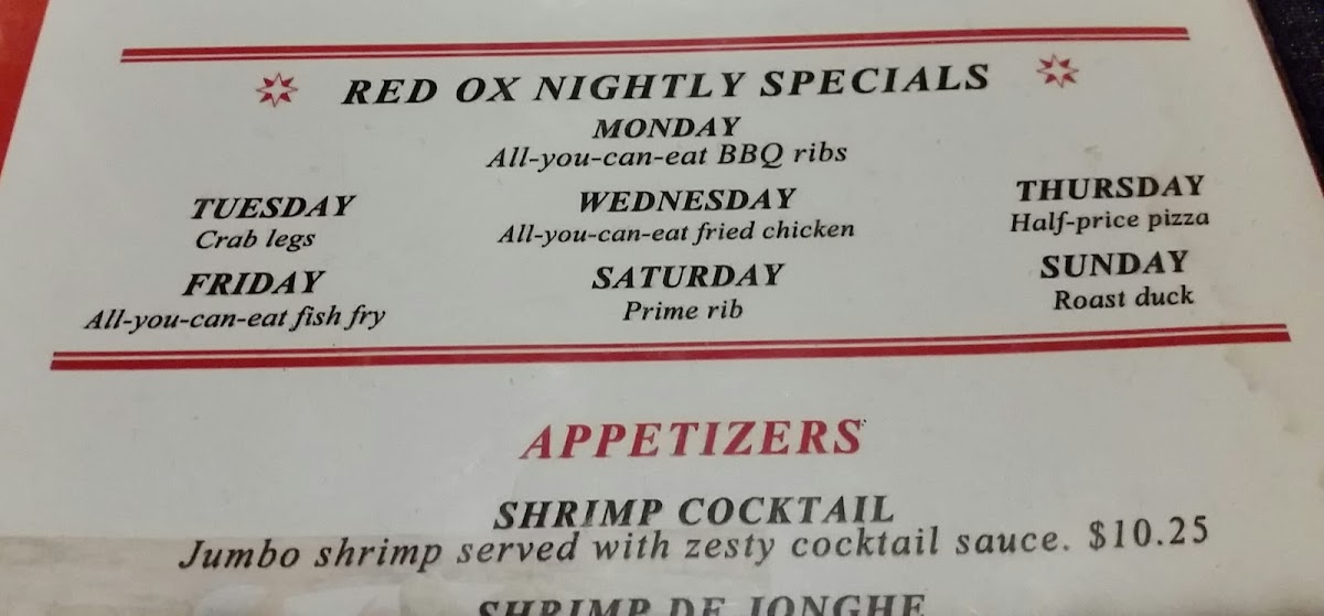 Introducing the menu at Red Ox Restaurant & Bar, where culinary excellence meets a warm, inviting atmosphere. Nestled in Hampshire, IL, this eatery delights patrons with a diverse array of dishes, from monthly specials like Chicken or Steak Fajitas and Rotisserie Chicken to signature appetizers such as the classic Shrimp Cocktail. The highlight of the week is the savory Prime Rib served every Saturday, enticing meat lovers with its rich flavor.